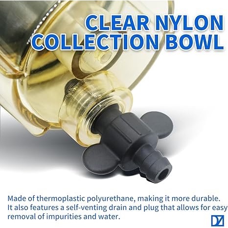 황동과 투명한 수거통과 같은 내구성 있는 소재로 제작된 이 필터 어셈블리는 신뢰성과 간편한 유지 관리를 제공합니다. 내장된 필터 엘리먼트는 미세 천공된 표면을 통해 불순물을 효과적으로 걸러내고, 투명한 수거통은 물과 이물질이 쌓인 곳을 명확하게 보여줍니다. 이러한 특징은 적절한 유지 관리를 보장하여 오염 물질로 인한 엔진 손상을 방지합니다.